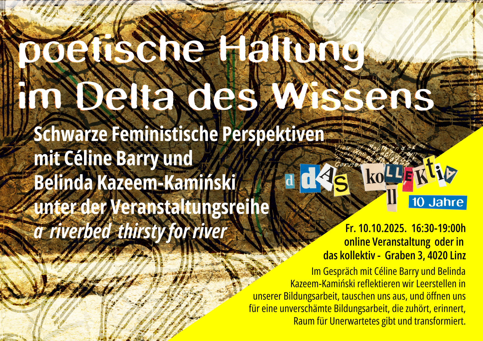 In der Veranstaltung „Poetische Haltung im Delta des Wissens“ – Schwarze Feministische Perspektiven mit Céline Barry und Belinda Kazeem-Kamiński wollen wir einen gemeinsamen Raum eröffnen, in dem sich poetische Haltung, Erinnerung, Widerstand und Schwarzer Feminismus als querfließende Kräfte in der Erwachsenenbildung mit Migrant*innen verweben.